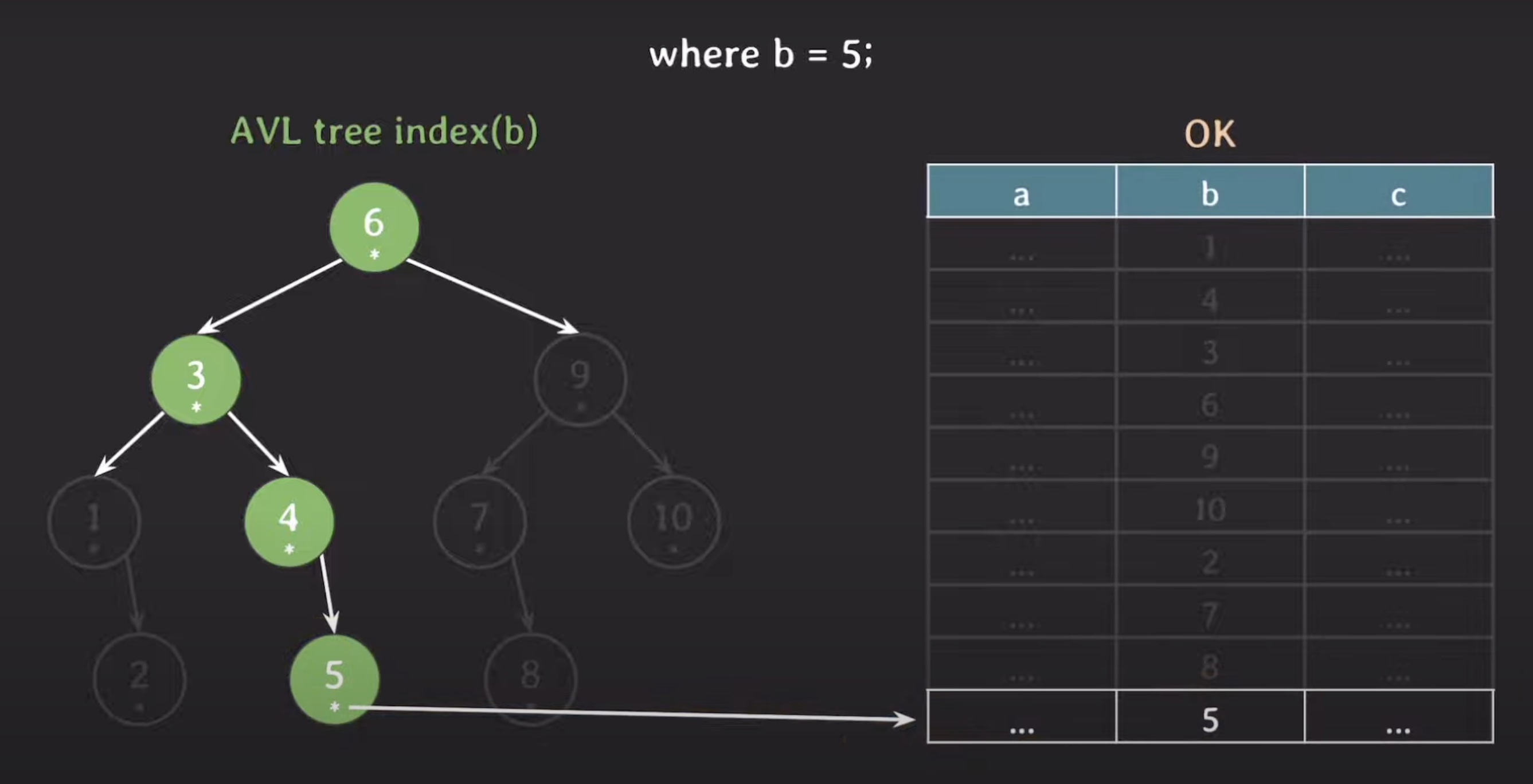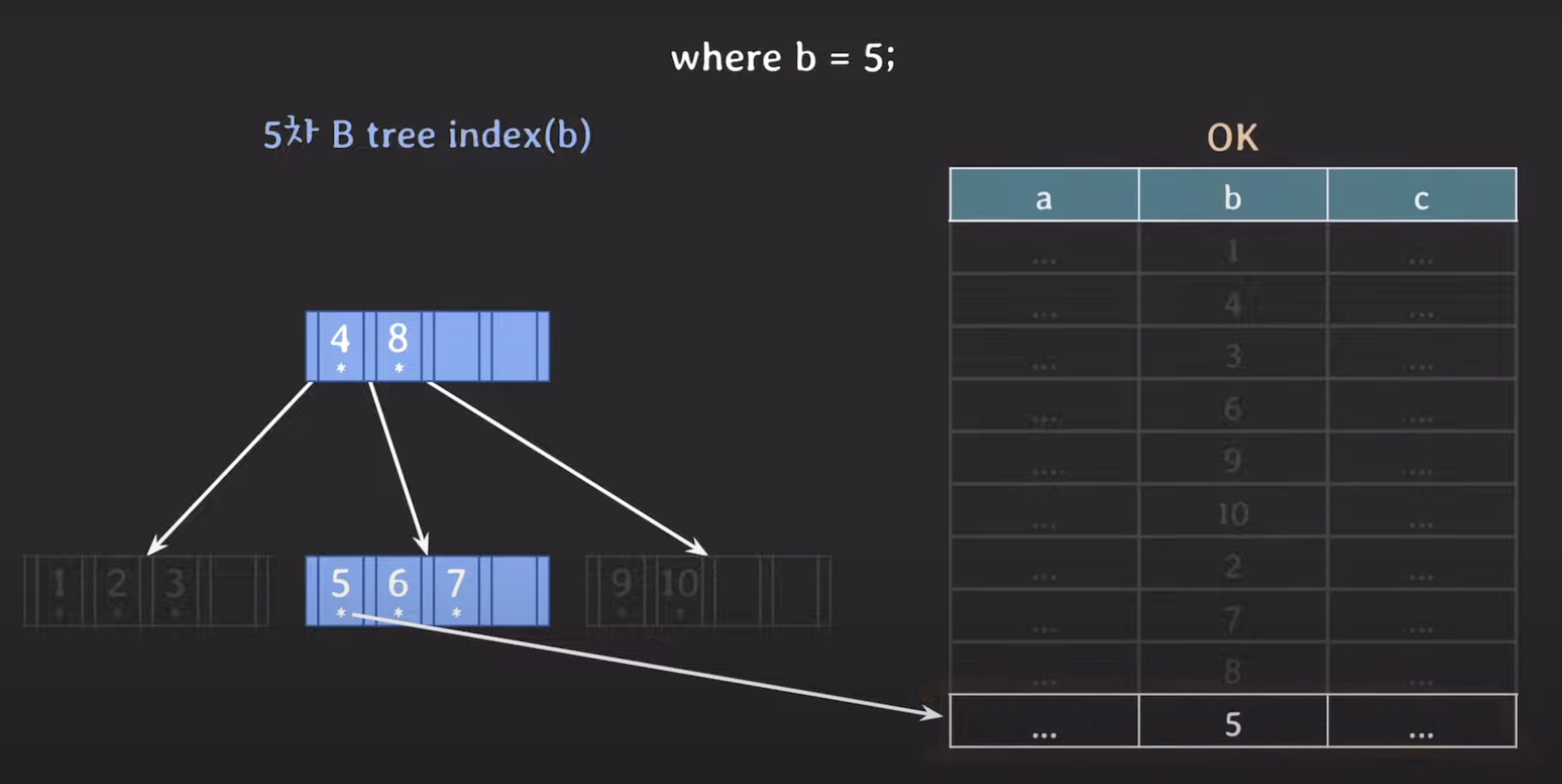 b = 5인 데이터를 찾는다고 할 때, secondary storage에서 6, 3, 4의 포인터를 거쳐 5를 찾아내고, 5가 저장된 위치를 알아내 테이블에 접근한다.