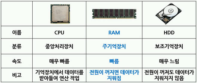 영구적으로 저장되는 곳 ⇒ 껐다 켜도 남아있다! - 실행중인 프로그램의 데이터 일부가 임시 저장 되는 곳
