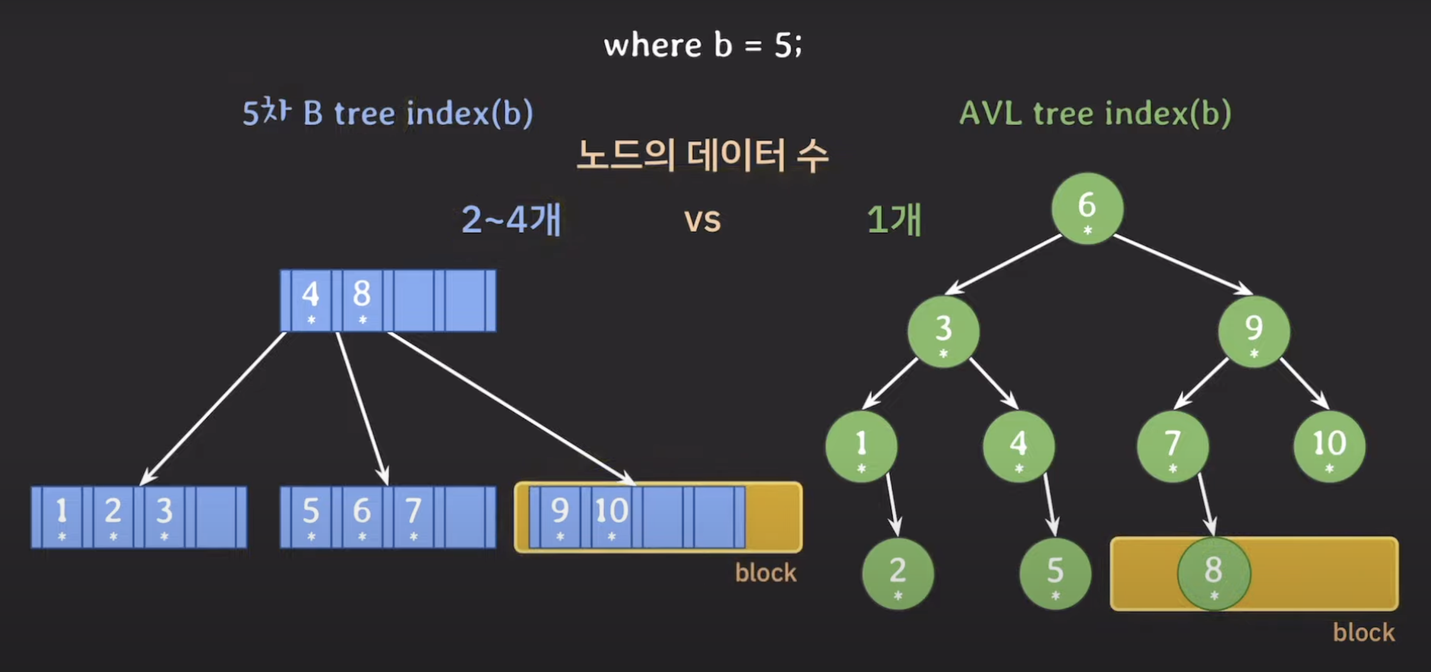 또 하나의 노드에 있는 데이터 수로 비교했을 때, 5차 B Tree는 2~4개고, AVL Tree는 1개다. block 단위로 가져오게 될 때, AVL Tree는 하나의 데이터와 함께 블락의 나머지 공간에는 관련 없는 데이터를 가져오게 되는 반면, B Tree는 실제로 사용될 데이터를 함께 가져올 가능성이 높다.