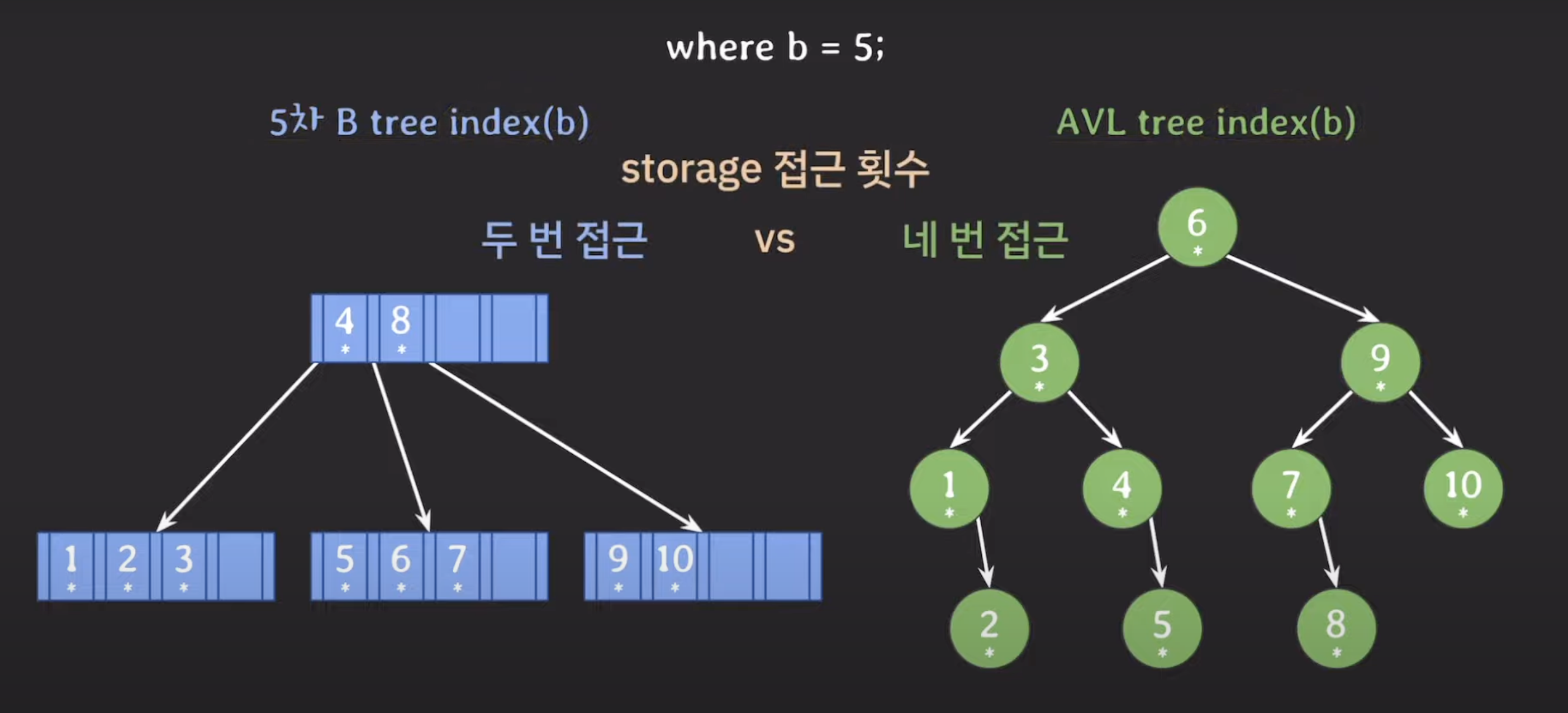 - B Tree index는 self-balancing BST(AVL Tree, Red-Black Tree)에 비해서 secondary storage 접근을 적게 한다.