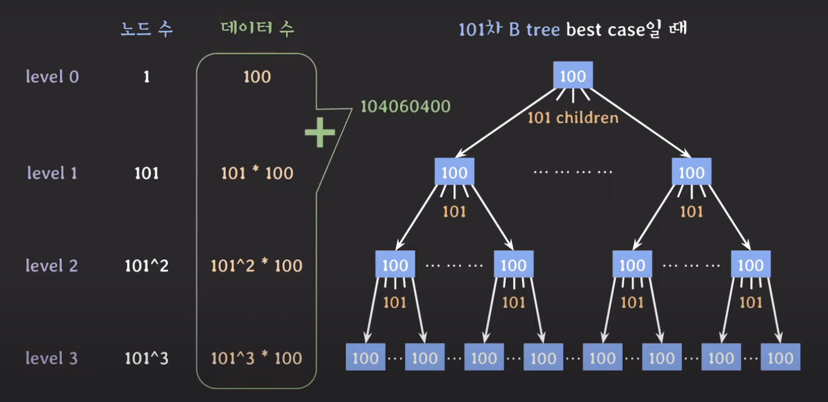 ⇒ best case에서 약 1억 개의 데이터에 3번의 secondary storage 접근으로 모든 데이터를 탐색할 수 있다.
