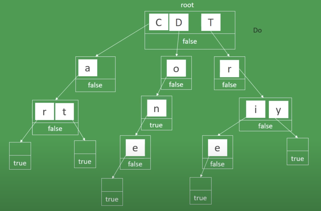 위의 그림으로 다시 예를 들어, Do를 탐색하려고 한다면, 루트 노드에서 D로 이동하고, 그 뒤에 나오는 O로 이동한 후 O의 자녀 노드 중 단어의 완성을 뜻하는 true를 가지는 자녀가 있기 때문에 Do를 탐색하는데 성공한다.