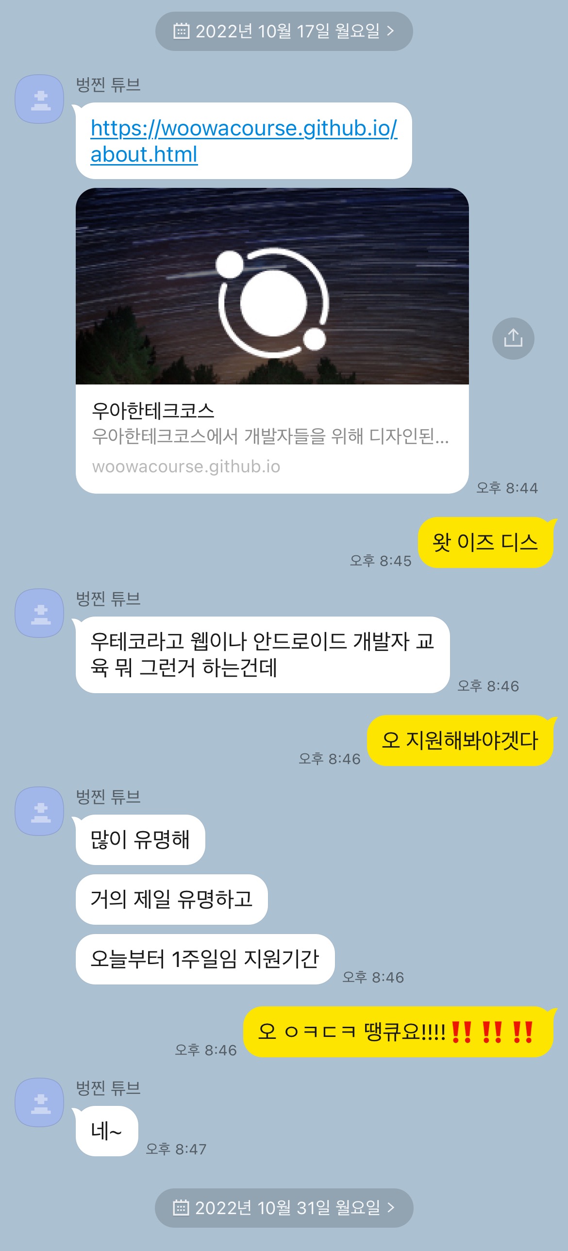 | [About. 깃짱] 깃짱은 우테코 수료 이후 어떻게 살아갈 것인가? (5) | 2023.10.14 |
