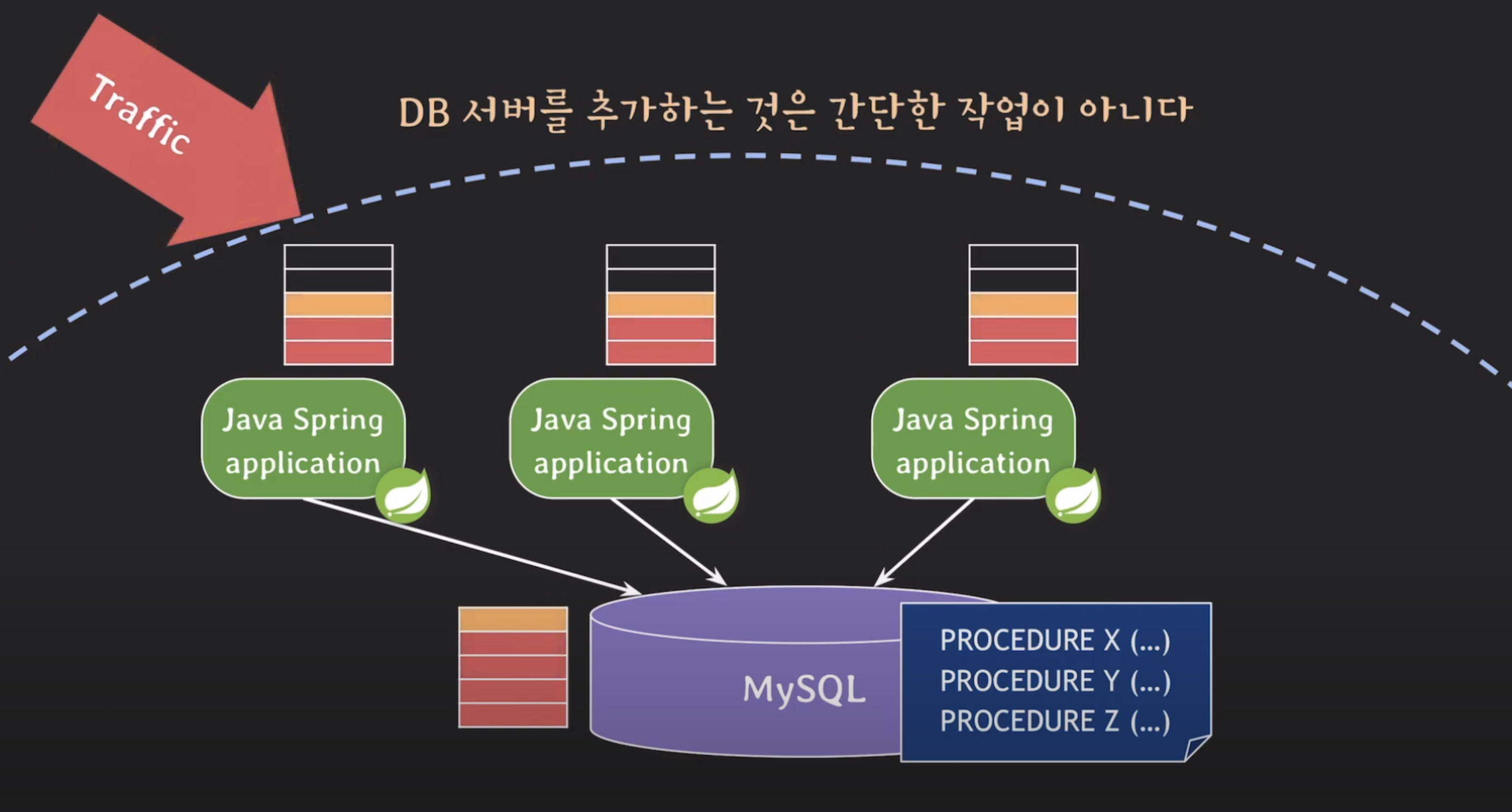 - DB가 프로시저를 통해서 비즈니스 로직을 사용해 트래픽이 늘어났을 때, cpu 사용량이 크게 증가한다.