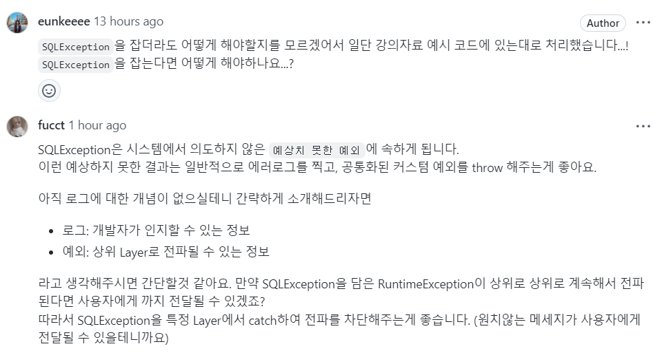 이번 리뷰어였던 디디는 예외 메세지에 대한 피드백을 몇 개 달아주었다. 달아주면서도 예외 처리에 대한 부분은 아직 감이 잘 오지 않을 것이라고 말해주긴 했지만 이번에 알게된 몇 가지를 정리해 보았다.