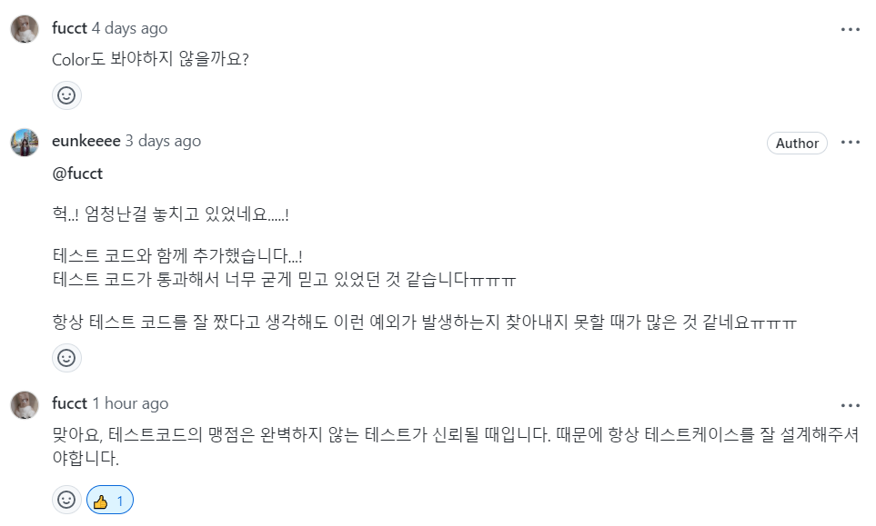 TDD가 조금 손에 익으니, 좀 생각 없이 프로덕션 코드를 작성하게 되어서 한 두 번 정도 이렇게 빈 케이스들을 리뷰어가 찾아줬었다. 테스트 케이스에 대한 설계에 좀 더 신경써야 할 것 같다.