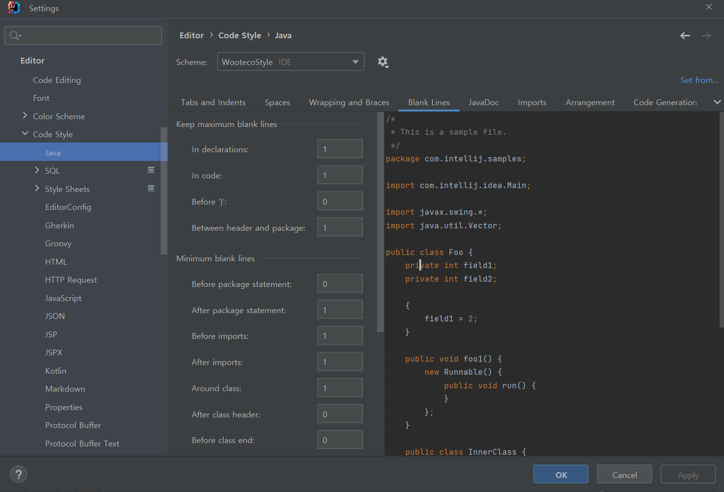 Settings > Editor > Code Style에 들어가면, Blank Lines이나 Conde Generation 등등 굉장히 구체적으로 설정할 수 있다.