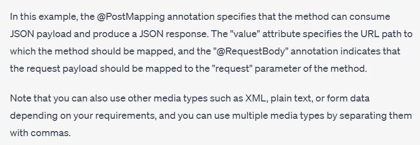 @PostMapping(value = "/example", consumes = MediaType.APPLICATION_JSON_VALUE, produces = MediaType.APPLICATION_JSON_VALUE)
