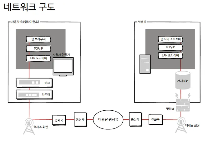 브라우저 주소창에 깃짱코딩.com을 입력하면, 먼저 DNS 캐시를 확인하고, 없는 경우 DNS 서버에 질의를 하는 식으로 흐름이 이어집니다.