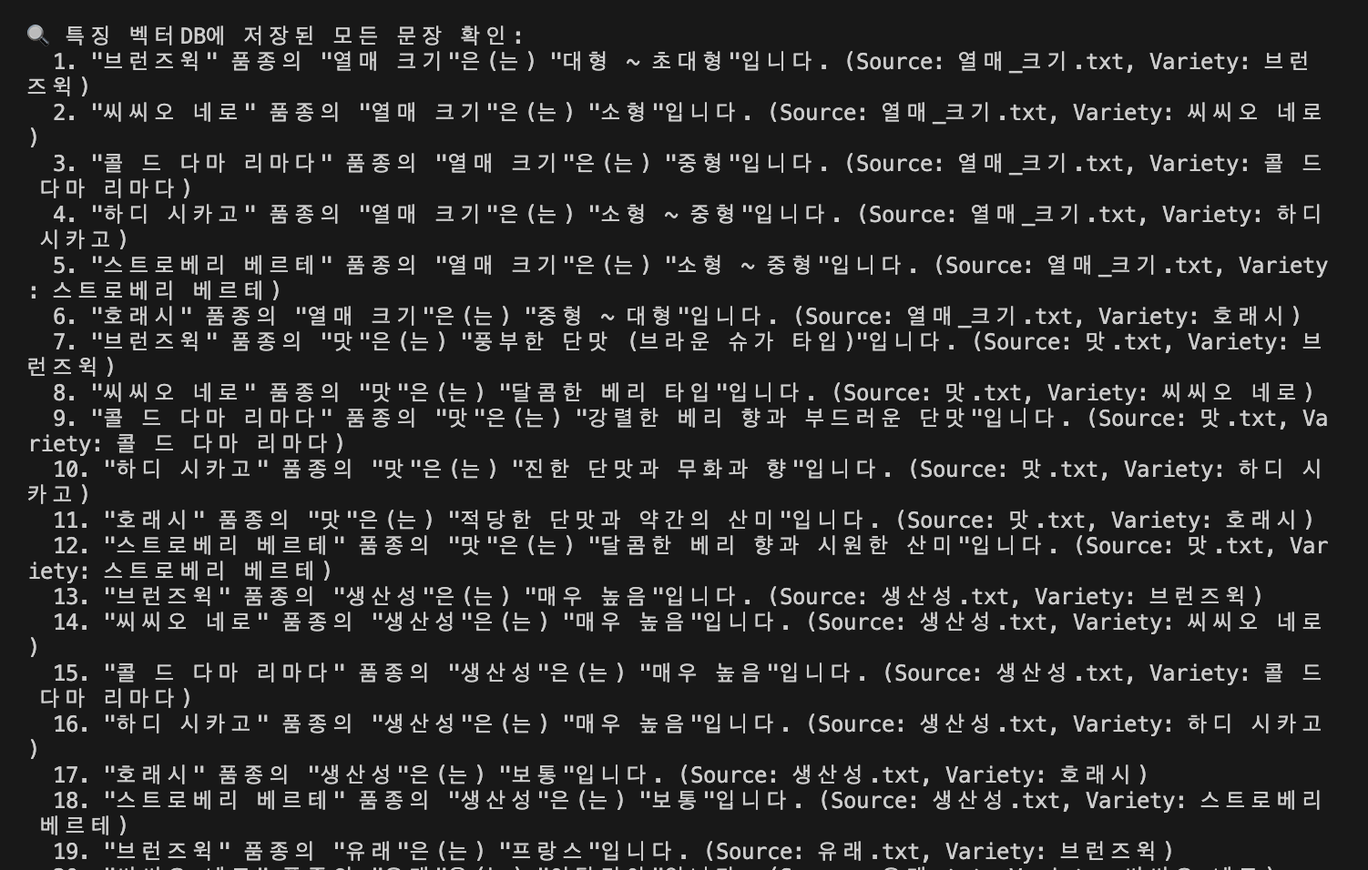 결과적으로 품종 이름만을 vector db에 저장했습니다.