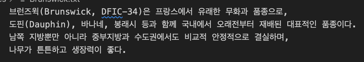 무화과도감을 LLM이 해석한 자연어를 각각은 txt 파일에 넣었습니다. 좀더 와닿도록 하나만 예를 들어서 보여드리자면,