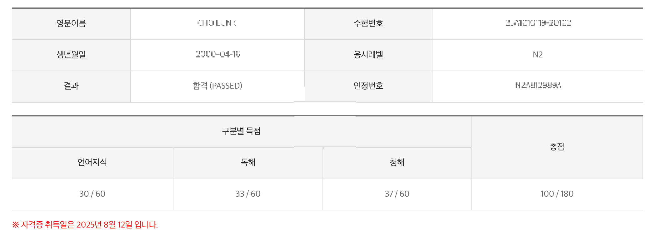 3주로 비교적 좀 길게 공부해서 N3는 꽤 안정적으로 합격했다. 특히 독해가 만점인게 와우였음