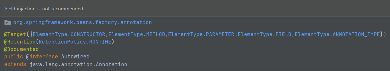 따라서 사용하지 않는 것을 권장한다. 실제로 필드 주입 방식을 사용하면 IDE에서 아래와 같은 warning을 만날 수 있다.