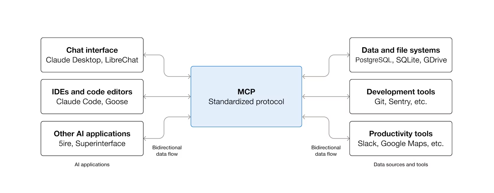 MCP는 LLM이 외부 도구와 서비스에 엑세스하고 상호작용할 수 있도록, 정보도 검색해 읽고 쓰기 작업도 할 수 있도록 하는 양방향 상호작용 레이어를 제공하는 프로토콜입니다. (웹소켓식 양방향은 아님! 나중에 한다고는 하는 것 같음)