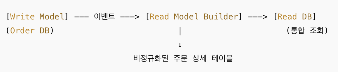 CQRS에서는 조회 전용(read model) DB를 별도로 구성합니다. 이 DB는 정규화되어 있지 않고, 화면에 최적화된 형태로 구조가 잡혀 있습니다. 주문 상세에 필요한 데이터를 미리 한 테이블에 담아두는 식입니다.