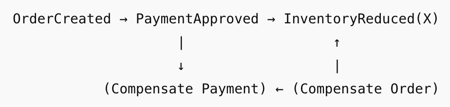 - 실패 흐름: T3 실패 → 보상(T2 취소) → 보상(T1 취소)