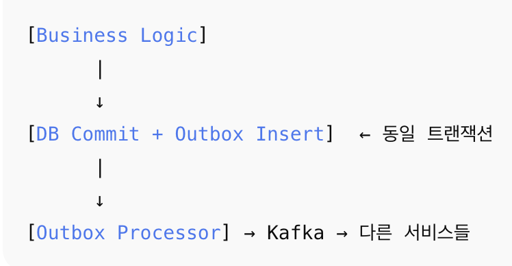 - Outbox Processor가 Outbox 이벤트를 Kafka로 안전하게 전달