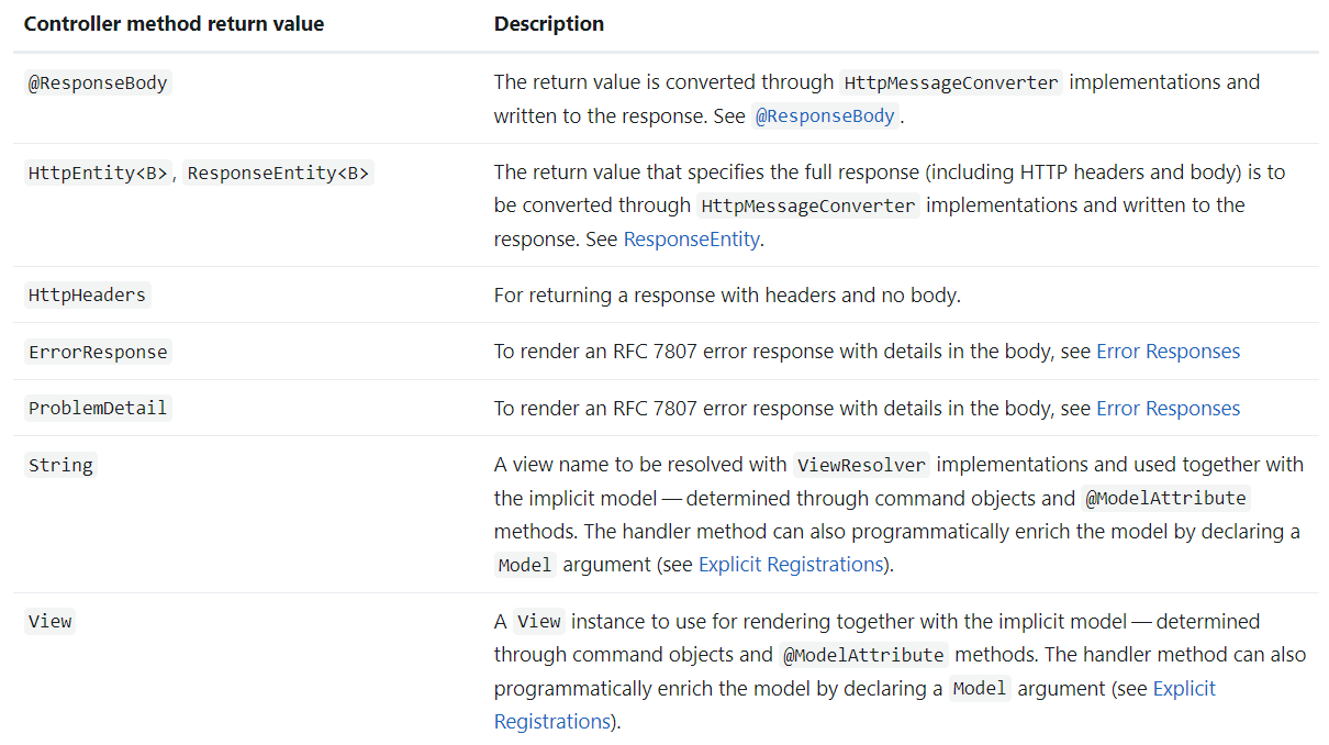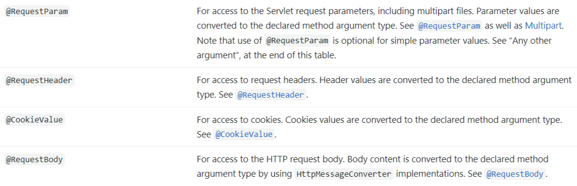 공식문서를 읽어보면, 다양한 어노테이션이 있다. 이것들은 메서드 파라미터에 붙이는 것들이고, Method Arguments라고 한다. 공식문서의 Method Arguments의 표에 나와있는 것들 중 일부를 가져와봤다. 천천히 공부해보자!