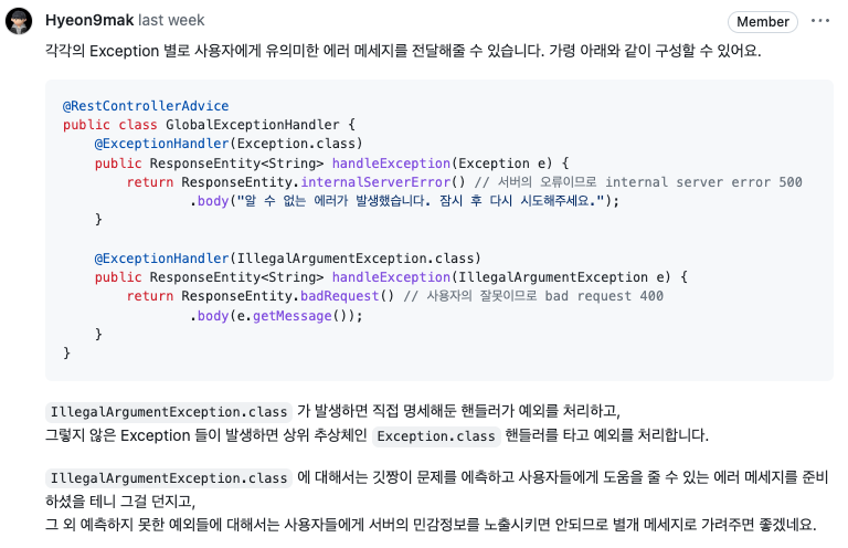 그리고 현구막의 포스팅을 하나 또 추천받았는데, 좀 센스 있는 예외 메세지에 대해서도 늘 연습을 해야겠다고 생각했다.