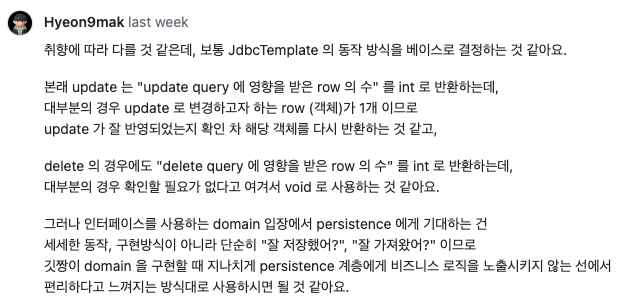 CRUD에 관해서 dao 인터페이스를 작성하는데, 메서드 시그니처 중에서도 특히 반환값을 어떻게 해야 할지 고민이었다.