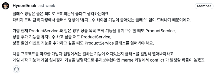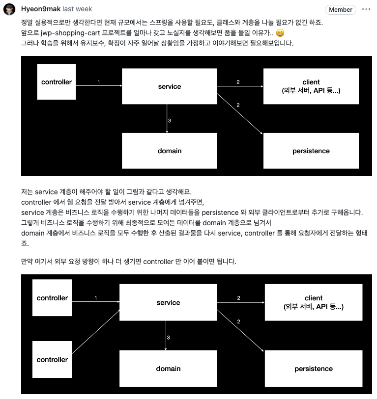 학습을 위해서 나쁘지 않다는 답변을 받았고 추가적으로 service 계층이 하는 역할이 무엇인지에 대해서 리뷰어의 생각을 들을 수 있었다.