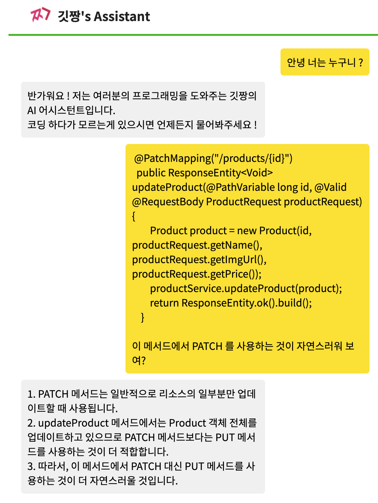 - 그 이유는 PATCH 에는 별다른 제약이 없어 구현방식이 굉장히 자유롭기 때문이다.