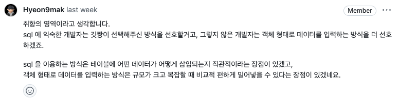 또 더미데이터를 추가해주는 방식에 대해서, 크게는 sql을 통해 INSERT하는 방식과 객체 형태로 데이터를 입력하는 방식 두 가지가 있어서 어떤 것이 더 적절할 지에 대해 궁금했다.