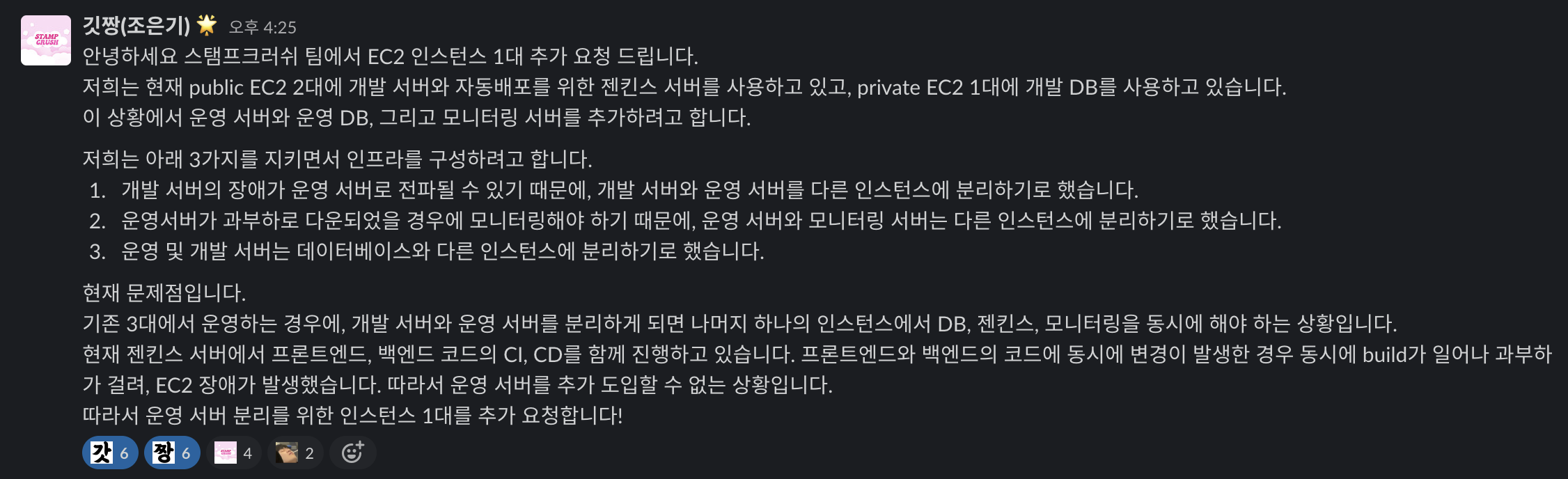 - 데이터베이스 서버, 운영 서버, 개발 서버, 인프라 서버로 분리해서 4대의 EC2를 사용함.